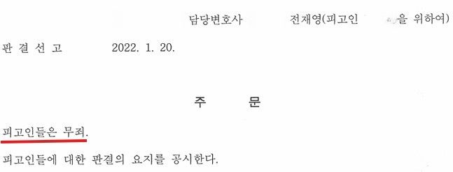 재판부는 전재영 변호사의 주장을 받아들여 피고인에 대해 유죄로 인정할 증거가 없다는 점을 인정하였고, 결국 의뢰인은 1심에서 무죄판결을, 검사가 항소하였으나 2심에서도 무죄판결을 받았고, 결국 무죄판결이 확정되어 억울함을 벗어날 수 있었습니다.