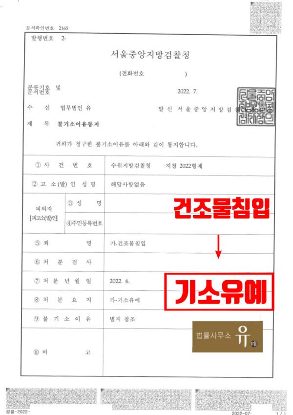 법률사무소 유(唯)의 형사전문변호사는 의뢰인과 신속한 상담을 진행하여 사실관계를 정확히 파악한 후 단순 건조물 침입으로 기소유예를 받는 것을 목표로 변론전략을 수립하고, 경찰 및 검찰조사에 동석하여 의뢰인이 불리한 진술을 하지 않도록 조력하는 한편, 의뢰인에게 유리한 양형자료를 최대한 수집하여 양형사유와 함께 특별히 없어진 물건 등이 없었다는 점 등을 강조하여 적시한 변호인의견서를 제출하였습니다.
