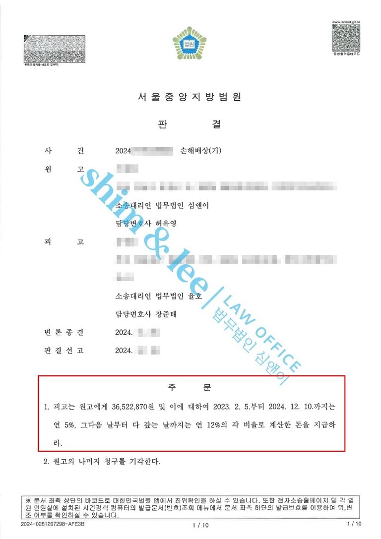 - 판결선고기일에는 심앤이가 주장했던 대로 변호사 수임료와 휴업손해, 위자료 총 3,650만 원이 인용 되었고 형사 공탁금 3,000만 원까지 더해 결과적으로 손해배상 6,650만 원을 받아냈습니다.