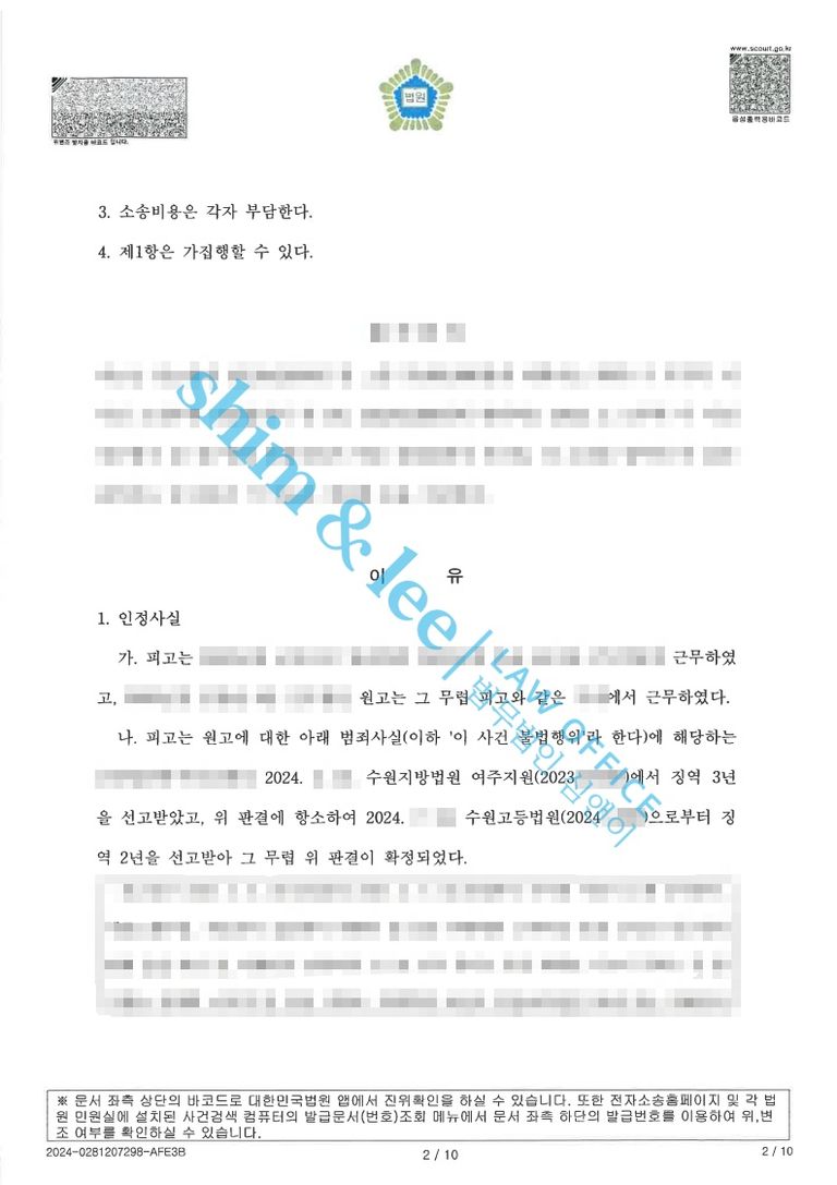 - 산부인과 및 정신과 병원기록과 휴직지원서 그리고 원고의 범죄피해평가보고서, 형사 판결문 등 입증에 유리한 형사 기록들을 수집 및 분류하여 변호사님이 추가 검토를 통해 원활하게 서면을 작성하실 수 있도록 조력했습니다.