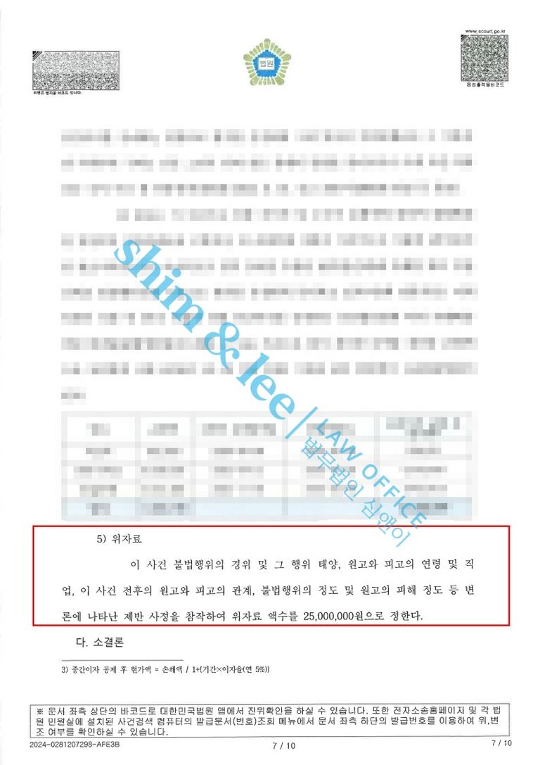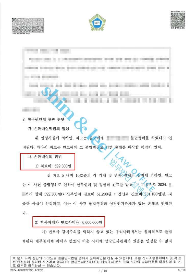 - 가해자를 엄벌에 처하고도 높은 금액의 손해배상금이 인용되어 심앤이와 의뢰인은 모두 기쁨을 감출 수 없었습니다. 형사 단계에서 힘들게 유죄를 입증하기 위해 변호사를 선임할 수밖에 없는 피해자분들은 민사 소송에서 위자료는 물론이고 변호사 수임료까지 받아낼 수 있습니다.