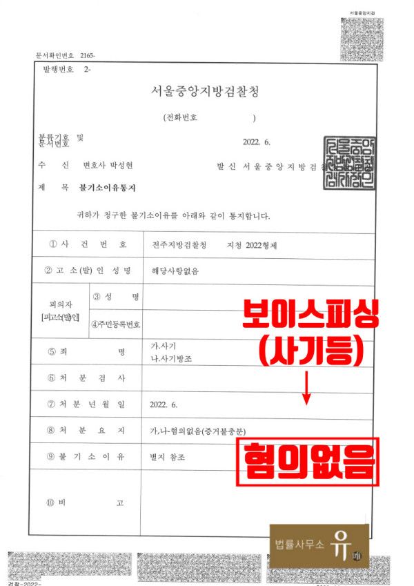 해당 사건을 수사한 경찰에서는 의뢰인의 사건을 기소의견으로 검찰에 송치하였으나, 전주지방검찰청 정읍지청은 법률사무소 유(唯)의 형사전문변호사의 변호인의견서 내용을 그대로 받아들여 의뢰인에게 보이스피싱 범행을 용이하게 하는 사기 및 사기방조의 고의가 없었다고 판단하여 의뢰인에게 무혐의 처분을 하였습니다.