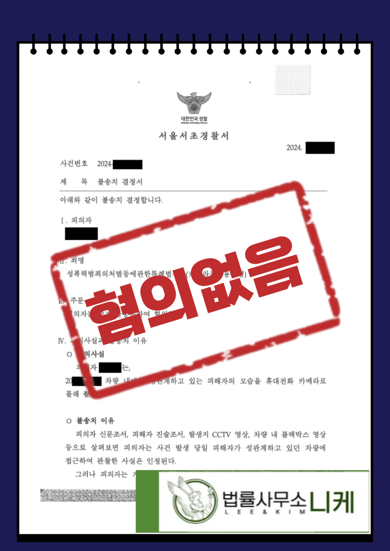 이에 변호인은 이 같은 내용을 토대로 의견서를 제출하여 수사관에게 불송치를 내려줄 것을 호소하였습니다.