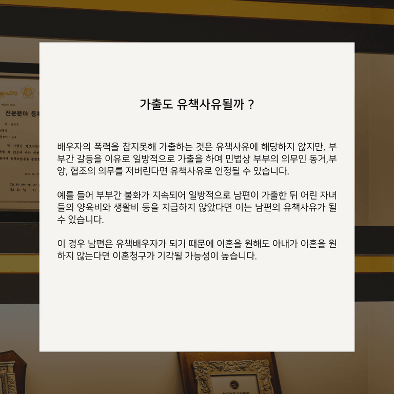 배우자의 폭력을 참지못해 가출하는 것은 유책사유에 해당하지 않지만, 부부간 갈등을 이유로 일방적으로 가출을 하여 민법상 부부의 의무인 동거,부양, 협조의 의무를 저버린다면 유책사유로 인정될 수 있습니다.