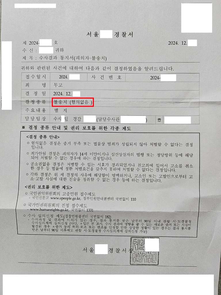 피진정인의 임금체불에 대한 형사재판에서 의뢰인분의 피해사실 부분은 결국 무죄판결이 선고되었음에도, 이유미 변호사가 주장한 부분들에 따라 경찰 수사관은 무고의 고의를 인정하기 어렵다는 것을 주된 이유로 하여 불송치 결정(혐의 없음)을 한 것입니다.