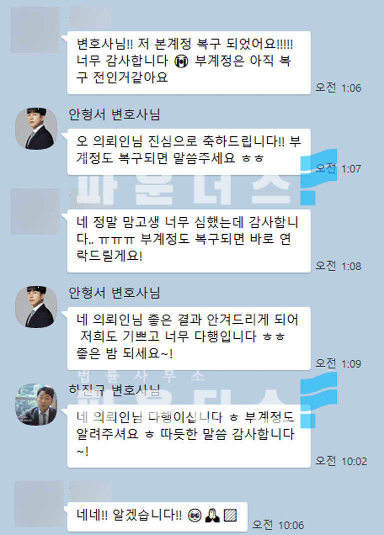 법률대리인은 앞서 파악한 내용을 기반으로 내용증명 작성을 통해 의뢰인 계정 비활성화의 부당함을 적극적으로 주장하며 계정 복구의 당위성 및 계정 복구 재검토를 요청하며 도움을 드렸습니다.