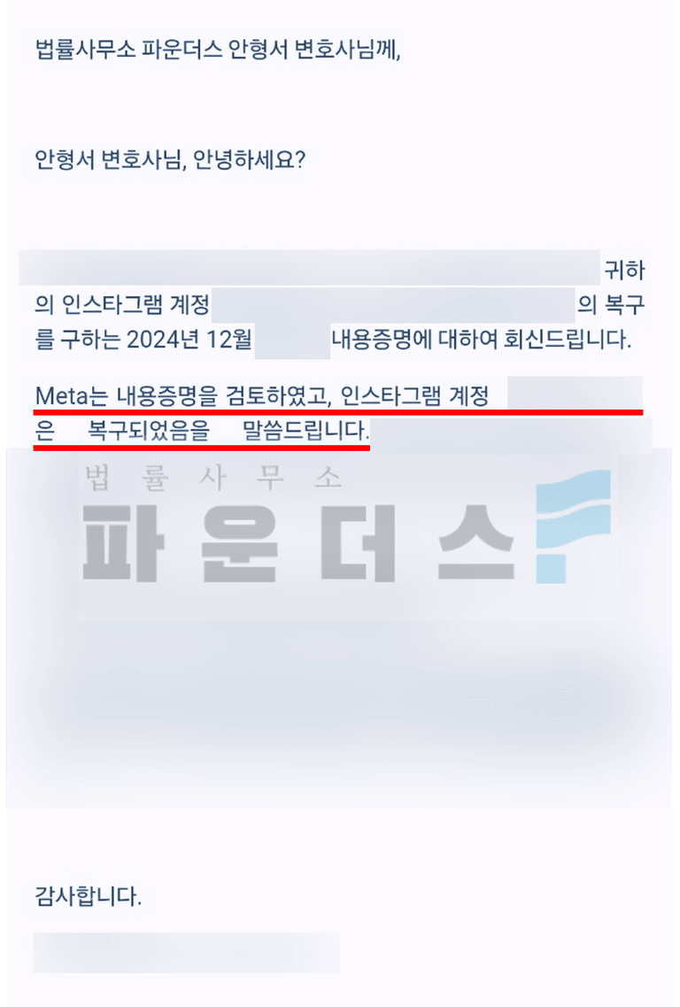 그 결과 의뢰인이 메타 측에 1:1 채팅과 문의를 여러 번 시도하였음에도 복구할 수 없다는 답변과는 달리 안형서 변호사의 내용증명 발송 이후 재검토가 이루어져 계정 복구에 이를 수 있었습니다.