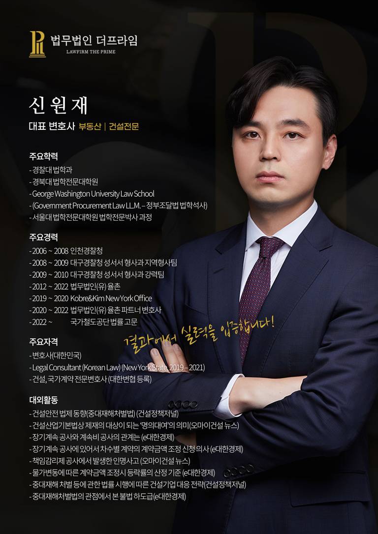 더프라임은 사건에 대한 면밀한 분석을 통해 의뢰인에게 최적의 해결책을 찾아드리고 있습니다. 공공조달 관련 사건은 국가계약법 내지 지방계약법 상의 여러 규정에 대한 이해와 해석이 선행되어야 합니다. 법무법인 더프라임의 신원재 대표변호사는 대한변호사협회 인증 국가계약 전문 변호사로서 공공조달 계약과 관련한 다수의 실무 경험과 전문성을 보유하고 있습니다.