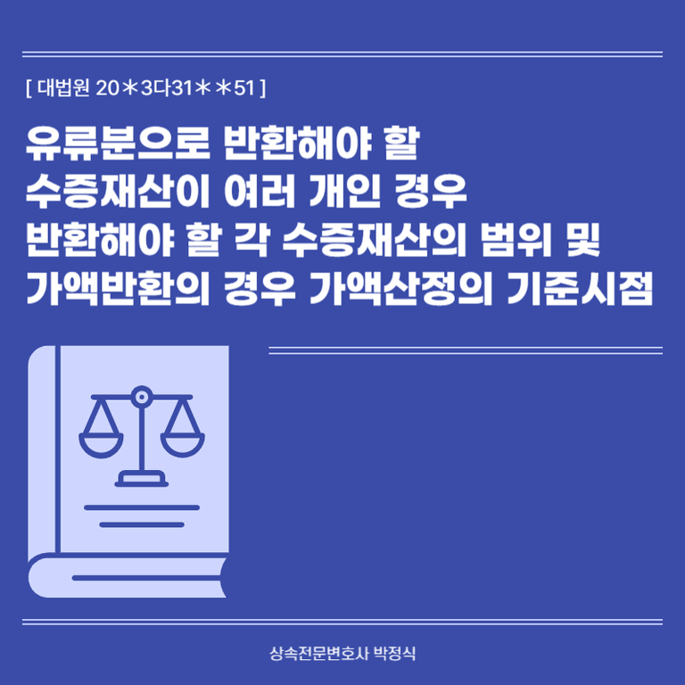 반환해야할 수증재산이 수 개인 경우 반환해야할 각 수증재산의 범위 및 가액반환의 경우 가액산정의 기준시점 등이 문제되었습니다.