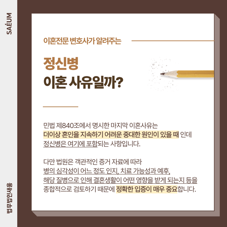 의외로 많은 분들이 고민하는 이혼 사유는 바로 배우자 정신병입니다. 지속해서 정신적인 질환을 앓고 있어서 함께 생활하기 어려울 지경에 이르렀을 때 과연 이혼을 요구할 수 있는지 물어보시는데요.