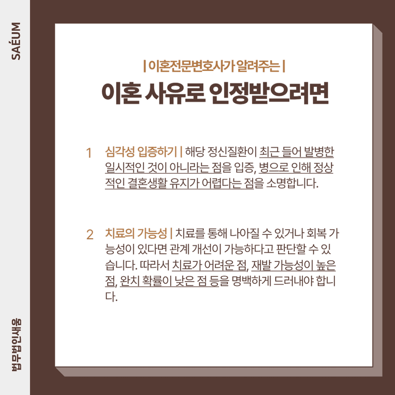 먼저 앞서 언급한 대로 심각성입니다. 해당 질환이 단순히 최근 들어 발병한 일시적인 것이 아니라는 점을 입증해야 합니다. 오랜 기간 앓았고, 앞으로도 병으로 인해 정상적인 결혼을 유지하기 어렵다는 점을 분명하게 소명해야 합니다.