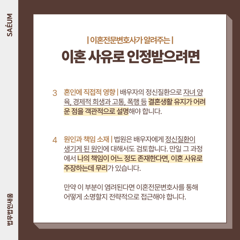 마지막으로는 책임 소재입니다. 법원은 배우자에게 정신병이 생기게 된 원인에 대해서도 주목합니다. 만일 그 과정에 나의 책임이 어느 정도 존재한다면 이혼 사유로 주장하는 데 무리가 있습니다.