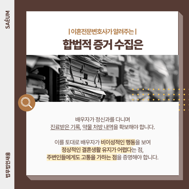 만일 위의 요건을 충족하여 소를 제기한다면, 본격적인 증거 수집에 들어가야 합니다. 배우자가 정신과를 다니며 진단 및 진료를 받은 기록을 비롯해 약물을 처방받은 내용이 있는지 확인이 필요합니다. 이는 정신병이 지속해서 심각한 수준으로 진화하였다는 점을 입증하는 근거가 되므로, 법률 상담을 통해 철저하게 확보하시기를 바랍니다.