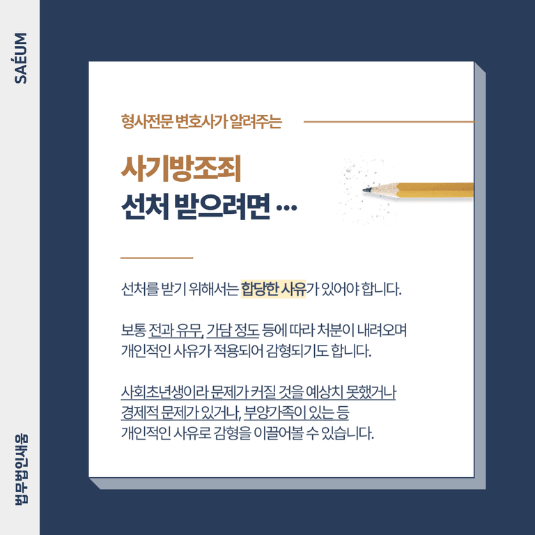 선처를 받기 위해서는 합당한 사유가 있어야 합니다. 보통은 전과의 유무, 가담의 정도 등을 살펴보고 그에 맞게 처분이 내려오게 됩니다. 이런 부분 외에도 개인적인 사유가 적용되기도 하는데요.