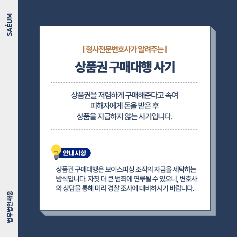 오늘은 여러 사기 수법 중에서도 상품권 구매대행사기 및 이에 연루되어 방조죄에 엮어 어려움을 겪고 있을 때의 대응에 대해서 알아보도록 하겠습니다.