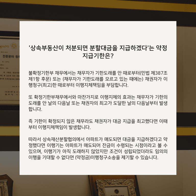 따라서 상속재산분할협의에서 아파트가 매도되면 대금을 지급하겠다고 약정했다면 이행기는 아파트가 매도되어 잔금이 수령되는 시점이라고 볼 수 있으며, 이행기가 아직 도래하지 않았지만 조건이 성립되었더라도 임의의 이행을 기대할 수 없다면 (약정금)이행청구소송을 제기할 수 있습니다.