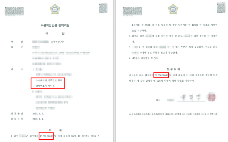 의뢰인은 과다한 금액을 청구당하였으나, 대리인의 조언을 통하여 사건의 진행 방향을 설정하고 그에 따라 소송을 진행한 결과 청구액을 무려 1천 500만 원 넘게 감액받을 수 있었습니다.