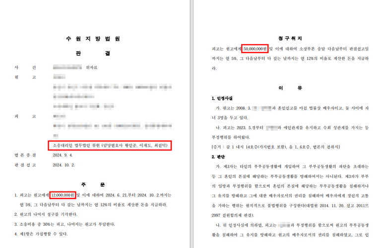 변호사는 상간사실은 인정하나, 상간남 아내의 주장과 다른 사실 및 부정행위 상대방과 그 배우자가 현재까지 혼인관계를 유지하고 있으므로 의뢰인이 상대방과 그 배우자의 혼인생활을 파탄에 이르게 하지 않은 점 등 사정을 정리하여 제출하였습니다.