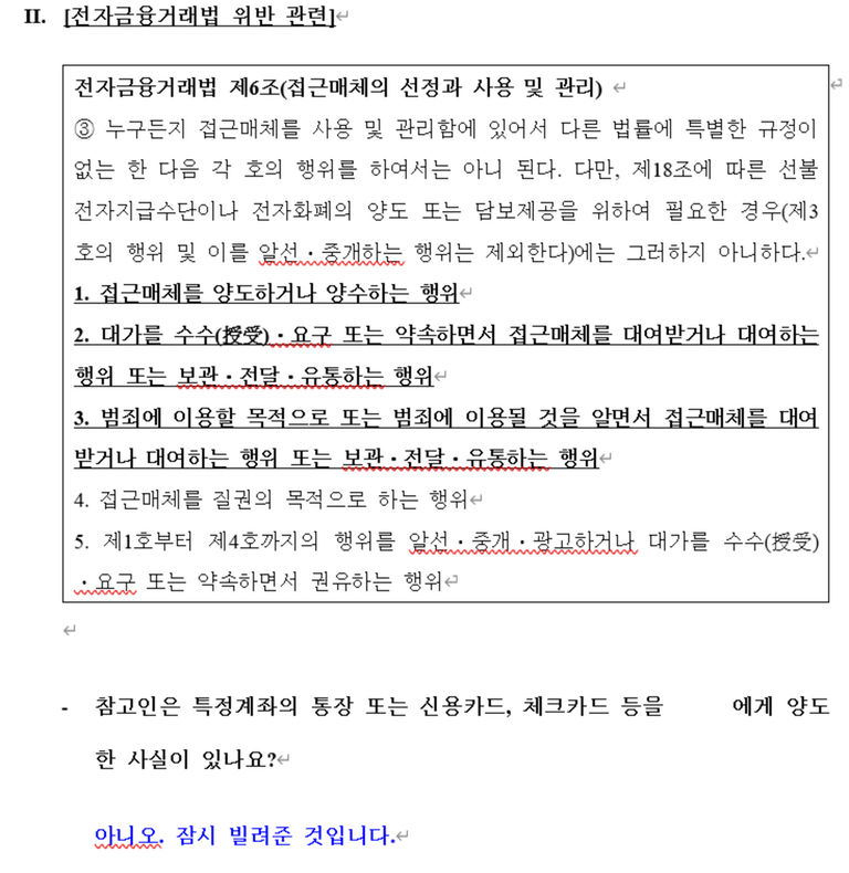 그렇기에 만일 아무런 대가가 오고 가지 않고, 어떠한 약속 또한 없었다면 전자금융거래법 위반을 부정해 볼 여지가 존재합니다.