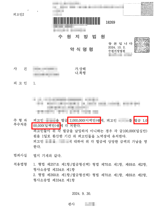 의뢰인은 이렇게 변호인의 조력을 통하여 상대방에게 벌금 2,000,000원의 약식명령을 선고가 내려지도록 할 수 있었고, 의뢰인은 이보다 낮은 금액의 벌금 1,000,000원의 약식명령을 선고받아 중한 형을 면하실 수 있었습니다.