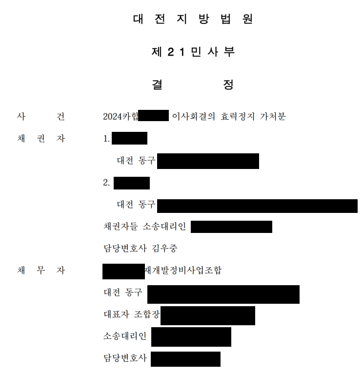 A,B를 대리하여 대전지방법원에 "이사회결의 효력정지 가처분"을 신청하였습니다.