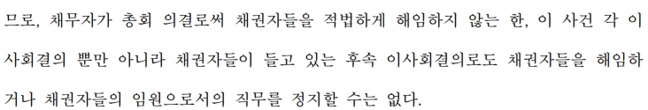 법원은 이를 받아들여 '조합이 총회 의결로써 임원들을 적법하게 해임하지 않는 한,