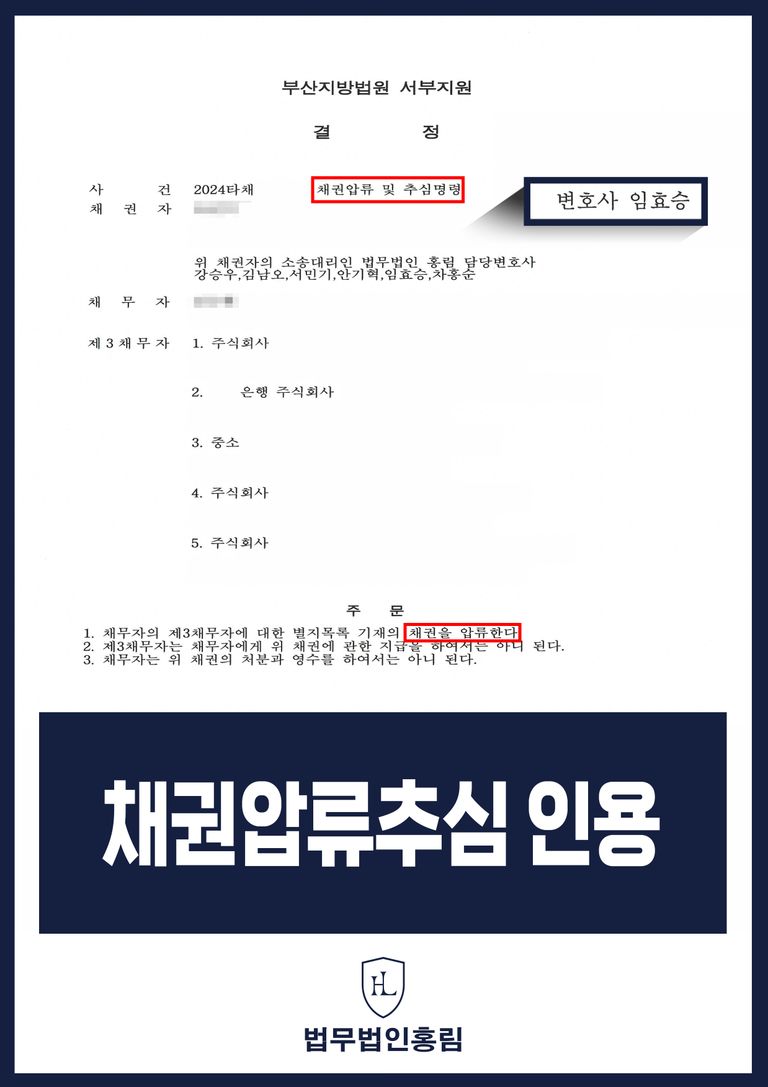 이에 본 법무법인은 의뢰인 A씨와 사건을 검토한 결과 의뢰인 A씨가 채권압류 및 추심명령을 통해 돈을 받을 이유가 상당하다고 판단하였고, 판결문과 관련 증거 자료를 기반으로 채권압류 및 추심명령 소를 제기하여 채권압류 및 추심을 할 수 있도록 조력하였습니다.