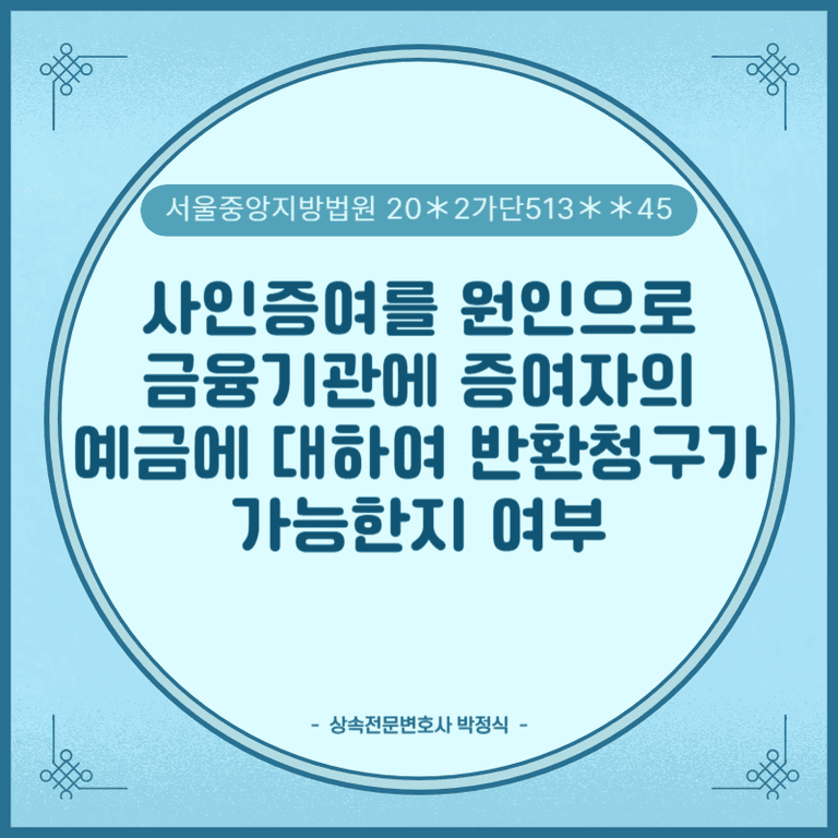 ① 원고들이 비록 모친의 친자녀인지 여부를 확인할 수 없어 원고들이 모친의 상속인이 아니지만, 모친은 생전에 원고들에게 모든 재산을 1/2씩 나누어주겠다는 유증약정서를 작성하여 주었고, 원고들이 이를 사인증여로 하여 모친의 친자녀로 등재되어 있는 제3자를 상대로 사인증여 이행청구를 하여 승소판결을 받았으므로, 모친의 예금을 보관하여 있던 금융기관도 사인증여에 따라 원고들에게 모친의 예금을 반환하여야 한다고 판단하였습니다.