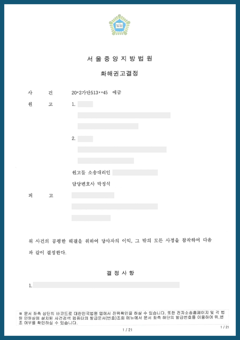 ② 이 사건에서 모친의 법정상속인은 제3자이지만, 모친이 자신의 모든 재산을 제3자가 아닌 원고들에게 유증한다는 유증약정서를 작성하여 주어 이는 사인증여로서의 효력이 있고, 원고들이 이미 제3자를 상대로 사인증여 이행청구를 하여 승소하였으므로 모친의 예금 역시 사인증여로 원고들에게 유증된 것으로 보아야 하므로 이는 제3자의 의사와는 상관없이 금융기관에서 원고들에게 모친의 예금을 반환하여야 한다고 판단하여 원고들에게 예금을 지급하라는 화해권고결정을 하였고, 원, 피고 쌍방 당사자들이 법원의 권고를 받아들여 이의를 하지 않아 화해권고결정이 확정된 사안입니다.