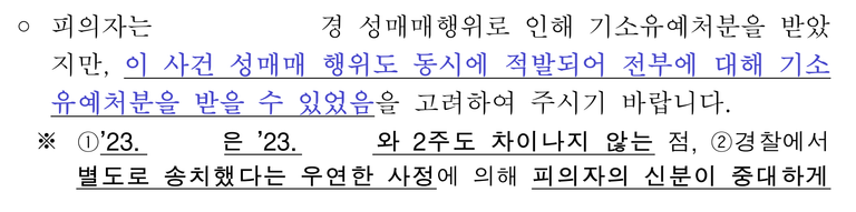 검찰 단계에서, 저는 가장 중요한 논거인 “비록 ② 성매수 행위에 대해 기소유예를 받은 사실이 있지만, ③ 행위와는 매우 근접하므로 동시에 적발되어 한번에 처분될 수 있었으므로, ③ 성매매에 대해서 기소유예 처분을 못한다고 보는 것은 가혹한 처사다”라고 주장하는 등, 의뢰인이 갖고있는 모든 양형요소를 체계적으로 주장하는 의견서를 작성하여 제출하는 한편,