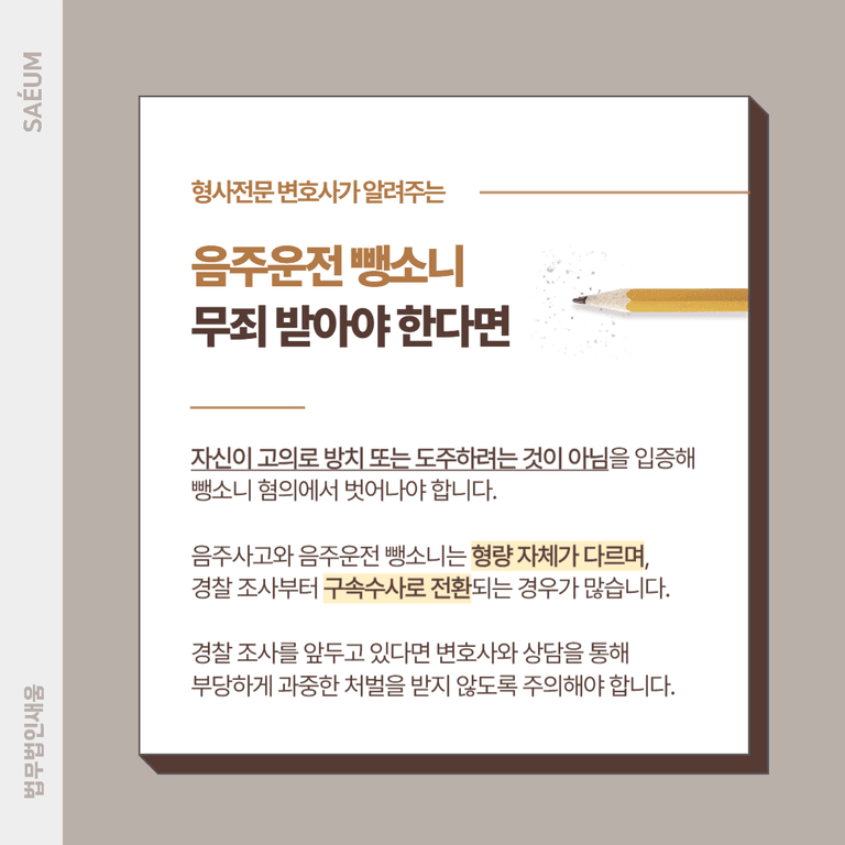 객관적으로 자신이 고의로 방치하였거나 도망가려는 것이 아니었음을 입증하여 뺑소니 혐의에서 벗어나야 합니다. 단순 음주사고와 음주운전 뺑소니는 형량 자체가 다르므로 부당하게 과중한 처벌을 받는 일이 없도록 해야 하는데요.