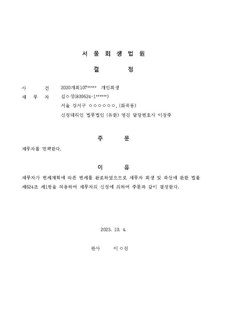 김 씨는 변제기간 동안 한 번도 납부를 늦추지 않았습니다. 그의 성실함과 가족을 지키고자 하는 책임감은 법원의 신뢰를 얻었고, 2023년 10월 마침내 면책 결정을 받았습니다.