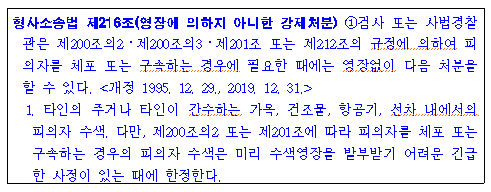 그런데 체포영장을 발부받아 체포를 집행하는 경우에는 원칙적으로 수색영장도 함께 발부받아 피의자를 수색해야 합니다.