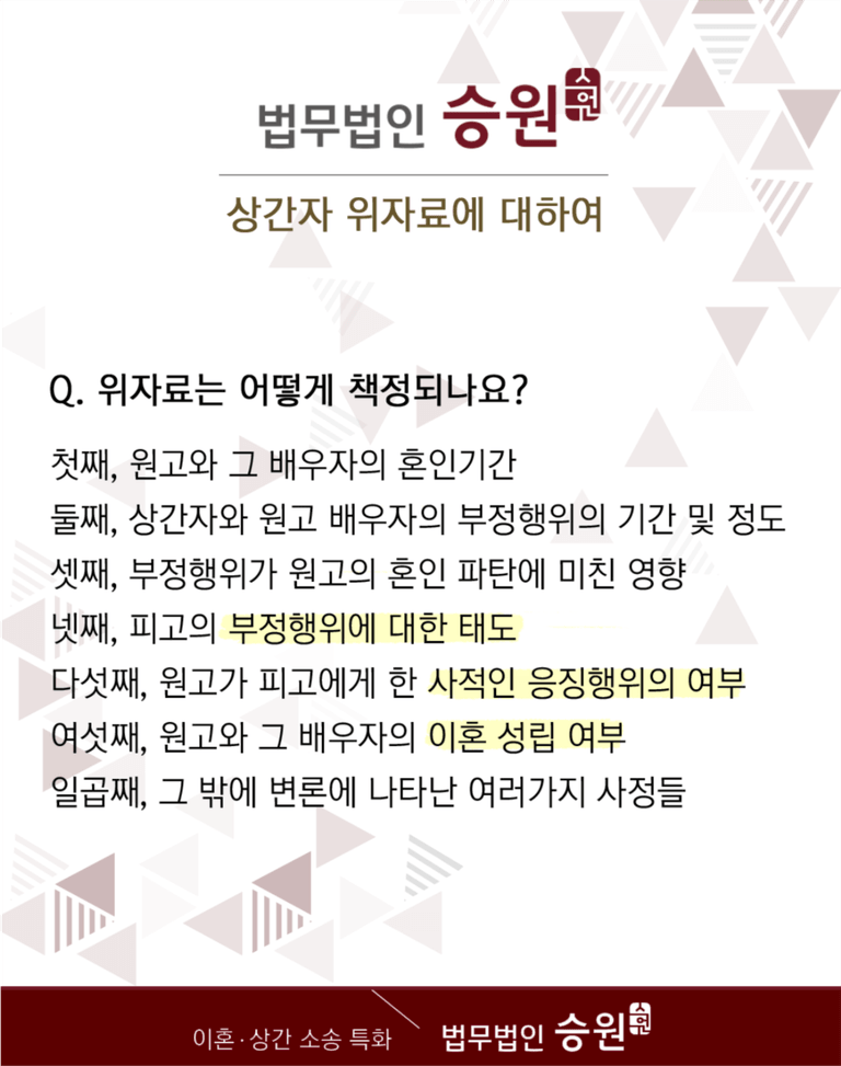 법원에서는 승원의 논리적인 주장들을 상당 부분 인용해 주었고, 그 덕분에 부정행위위자료방어로 원고가 청구했던 위자료의 2/3을 감액하는 위자료 판결이 내려질 수 있었습니다. (위자료 1,000만 원 판결.)