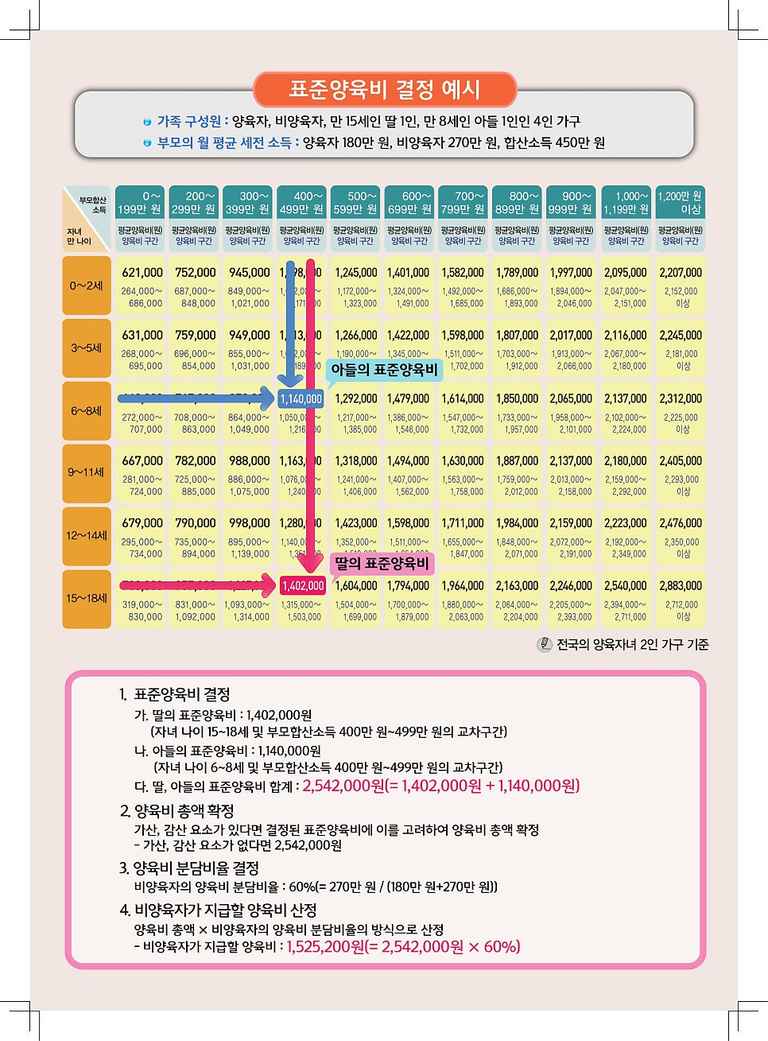 (이래 설명은 양육비의 대강을 예측해 보시라는 의미로 말씀드리는 것으로서, 모든 경우에 반드시 그대로 적용되는 것은 아닙니다)