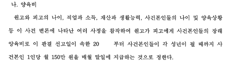 그래서 결국, 이혼 후 남편이 지급해야 될 양육비는 아이(사건본인) 1인당 월 150만 원으로 결정되었습니다.