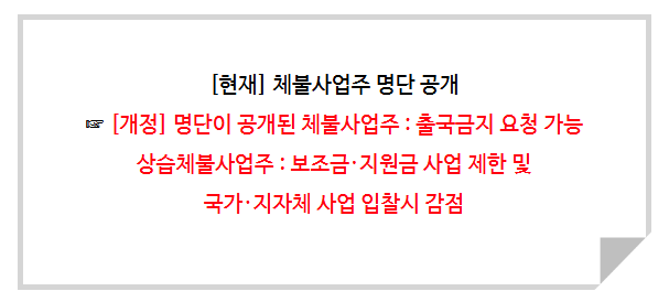 2025년부터는 임금체불로 명단이 공개된 체불사업주에 대해 출국금지를 요청할 수 있습니다. 체불임금을 지급하면 해제할 수 있도록 하여 임금체불을 신속하게 해결할 수 있도록 하였습니다. 또한, 3개월 이상 임금을 지급하지 않거나, 5회 이상 임금을 체불한 경우(3천만원 이상)에는 상습체불사업주로 보아 보조금이나 지원금 사업에서 제한하고 국가나 지자체 사업에 입찰할 때 감점하도록 명시했습니다.