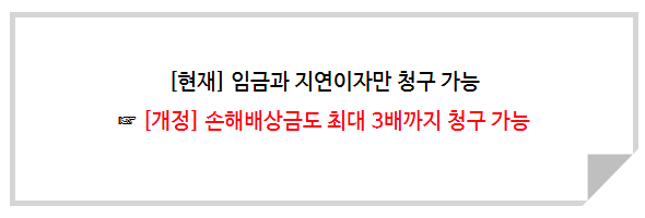 임금을 지급하지 않으면 임금과 지연이자만을 청구할 수 있었으나 앞으로는 최대 3배까지의 손해배상금도 청구할 수 있습니다. 징벌적 손해배상금이라 할 수 있습니다. 사업주가 고의로 임금을 지급하지 않거나 1년 동안 3개월 이상 지급하지 않은 경우, 지급하지 않은 임금 총액이 3개월 급여보다 많은 경우에는 손해배상금을 청구할 수 있도록 규정을 마련하였습니다.