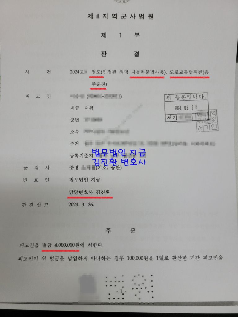 그리고 이어진 군 징계절차에서도 절도가 아닌 자동차불법사용죄가 재판에서 인정되었음을 적극 피력하여 감봉2월의 경징계를 받게 되었습니다.