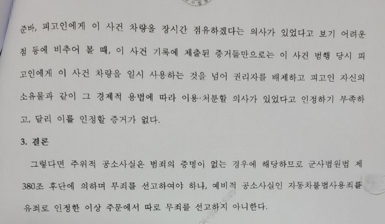 재판부도 ① 피고인이 초범인 점, ② 피고인이 회식장소로부터 3km 넘게 걸어가다가 이 차량을 발견하여 운전하고 숙소로 귀가한 점을 보면 피고인이 귀가 목적으로 차량을 일시 사용한 것으로 보이는 점, ③ 피고인은 일관되게 술에 취해 기억이 없고 잠에서 깬 후에 자신이 차량을 운전하여 온 사실을 알게 되어 소속대 간부들에게 말하고 경찰서로 가서 자수한 점 등에 비추어보면 피고인이 차량을 장시간 점유하겠다는 의사가 있었다고 보기 어렵다고 하면서 불법영득의사가 없다고 판단하였습니다.