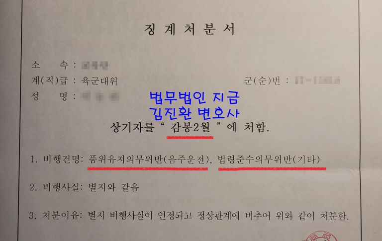 군인이 음주운전을 하면 형사처벌뿐만 아니라 중징계처분도 받게 되어 향후 진급이나 군복무에 큰 악영향을 받게 됩니다.