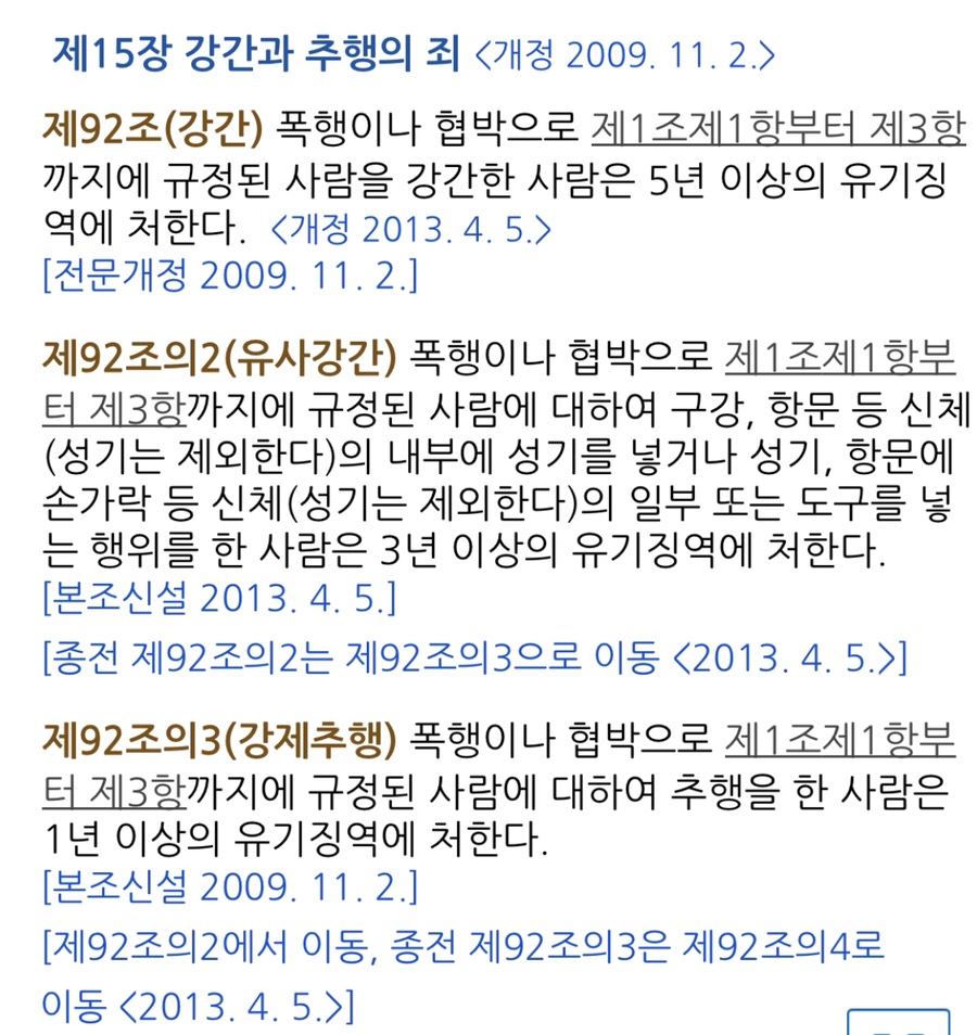 유사강간 : 구강, 항문 등 신체(성기를 제외한 부위)에 성기를 삽입하거나 항문에 손가락 등 신체(성기를 제외한 부위) 또는 도구를 삽입한 경우 3년 이상의 유기징역