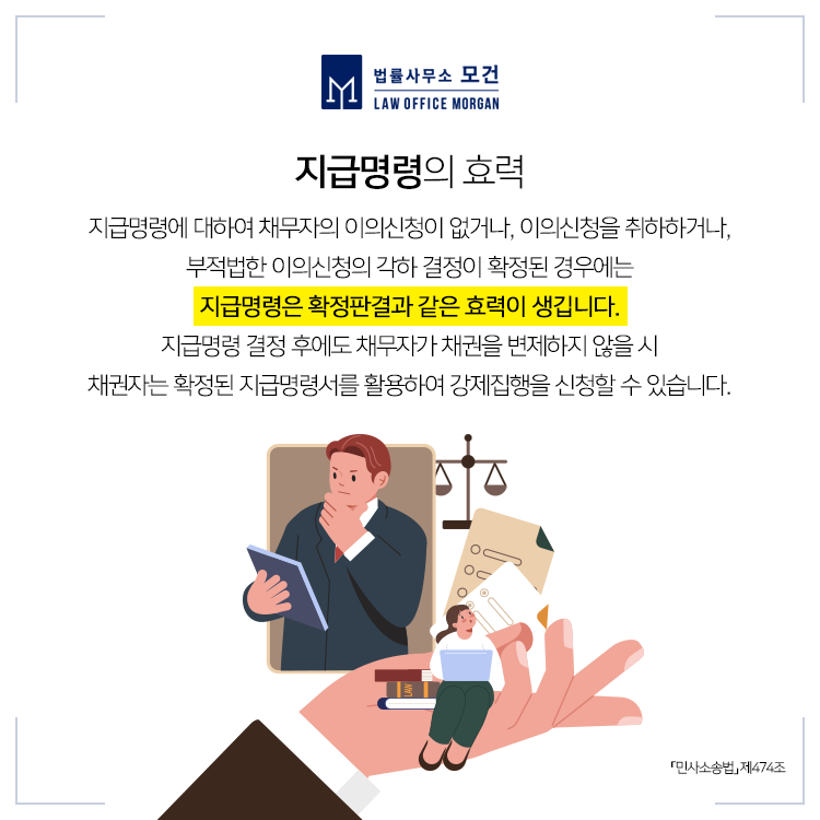 다만 지급명령을 받아본 상대방이 '내가 빌린 돈이 이정도는 아닌데?', '빌린게 아니라 증여금이라 갚을 필요가 없다'고 주장하는 때에는 이의신청으로 지급명령의 효력을 잃게되니 이경우에는 대여금반환청구소송을 제기하셔야 하겠습니다.
