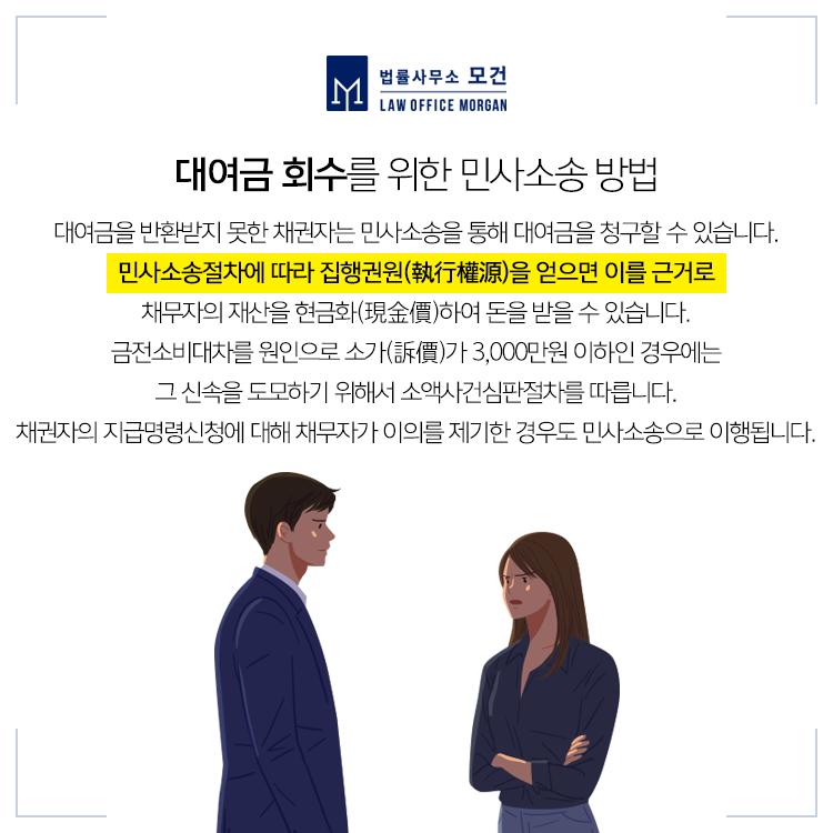 <법률사무소 모건>은 소액이어도 빌려준돈 회수를 위한 신속한 절차진행을 도와드리고 있습니다. 또 사안에 따라 단지 민사소송에 그치는 것이 아니라 금전 편취를 위한 '사기' 였음이 드러나는 경우에는 고소도 고민해보실 수 있는 만큼 전문가의 면밀한 검토가 필요합니다.
