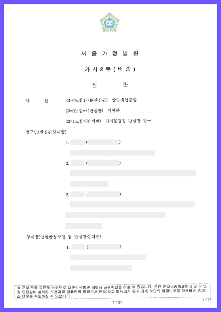 이에 장남과 차남은 각각 자신들이 피상속인으로부터 받은 현금 부분은 특별수익이 아니라고 주장하면서 각자 기여분결정 반심판청구를 한 사안입니다.