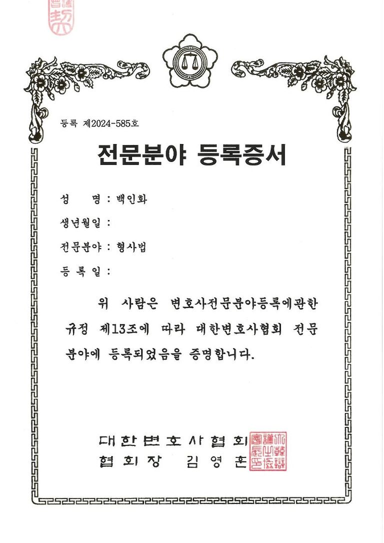 안녕하세요 대한변호사협회 등록 형사법 전문 백인화 변호사입니다.
