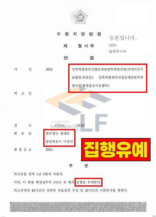 의뢰인이 자신의 잘못을 인정하고 반성하고 있다는 점, 피해자의 신체 부위를 찍은 사진을 외부에 유포하였다고 볼 만한 정황을 찾을 수 없는 점을 적극적으로 피력해 나갔고, 피해자와 원만한 합의를 통해 처벌불원서를 받아 변호인 의견서와 함께 제출하면서 선처를 요청하였습니다.