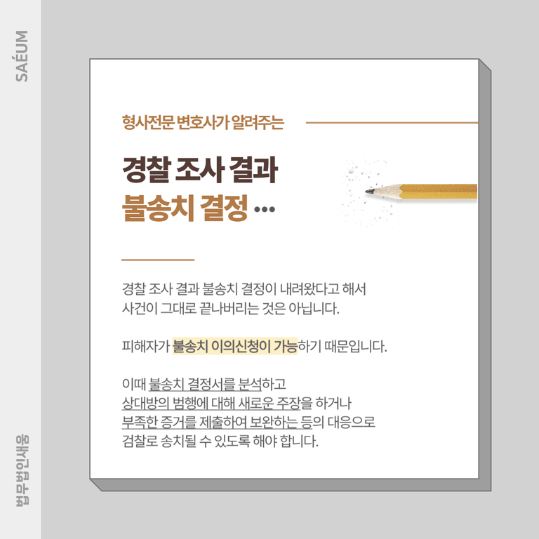 이때 사건을 검찰로 넘기기 위해서는 불송치 결정서를 분석하여 어떤 이유로 이런 결정이 내려왔는지를 확인해야 합니다. 그리고 상대방의 범행에 대해 새로운 주장을 하거나 부족한 증거를 제출하여 보완하는 등의 대응을 통해 검찰로 송치될 수 있도록 해야 합니다.