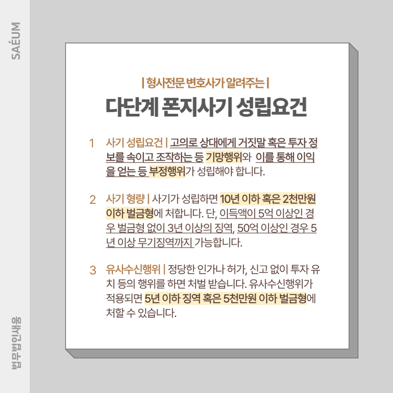 이 경우 보통 유사수신행위까지 적용이 됨에 따라 큰 처벌을 받는 경우가 많은데요. 다만 피해를 보았음에도 사기로 인한 피해가 아니라 개인의 결정으로 인한 투자 실패로 간주가 되는 경우 상대방이 그 어떤 처벌도 받지 않기에 주의를 해야 합니다.
