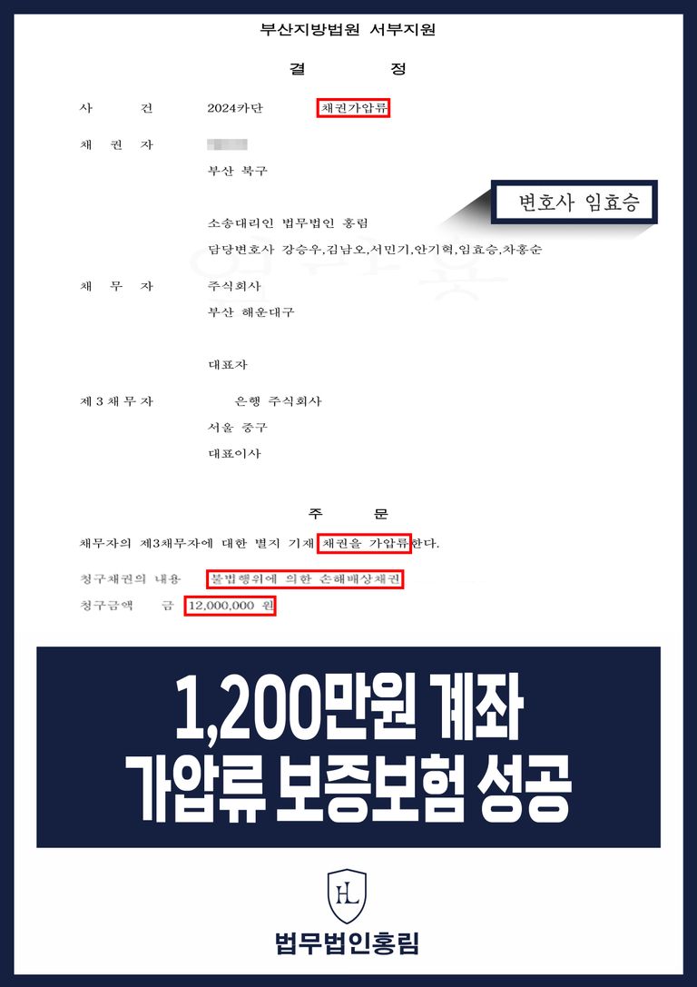 그 결과 법원에서는 본 변호인의 주장을 받아들여 통장 가압류(전액 보증보험)하였습니다.